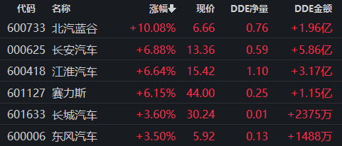 板块方面,汽车整车板块逆市上涨2.19%,领涨两市。其中,北汽蓝谷下午开盘后直线拉升,封上涨停,收盘时有26.19万手封单;另有长安汽车、江淮汽车、赛力斯等股集体涨逾6%。