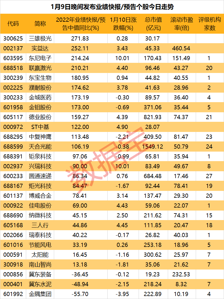 昨日盘后,27家上市公司相继发布2022全年业绩预告,多股净利润表现优异。数据宝统计,共计24股业绩同比预增,占比近九成。以快报数据或预告中值计算,12股全年净利润同比翻倍,其中三雄极光、实益达、东尼电子和联赢激光预计增幅在200%以上。