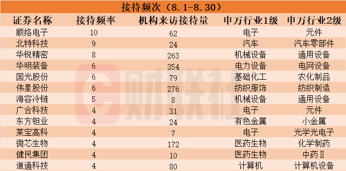 据Choice数据统计,截至发稿,沪深京三市近一个月(8.1-8.30)共1014家上市公司接受机构调研。具体来看,接待机构调研次数最多的上市公司为顺络电子达到10次,北特科技紧随其后,接待次数为9次,华锐精密接待次数8次,华明装备、国光股份和伟星股份接待次数均为6次。具体详见下图: