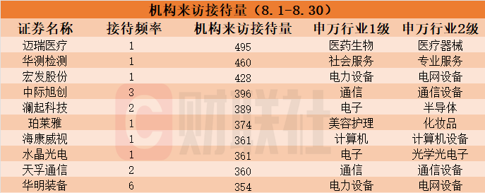 按机构来访接待量统计,迈瑞医疗、华测检测、宏发股份、中际旭创、澜起科技、珀莱雅、海康威视、水晶光电、天孚通信、华明装备接待量位列前十,前三名迈瑞医疗、华测检测、宏发股份机构来访接待量分别达495、460、428家。具体详见下图:
