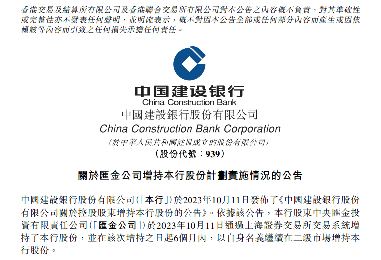 建设银行(0939.HK)公告,截至2024年4月10日,汇金公司通过上海证券交易所交易系统累计增持建设银行A股股份7145万股,约占建设银行总股本的0.03%。汇金公司共持有建设银行股份1428.58亿股(其中A股2.67亿股,H股1425.9亿股),约占建设银行总股本的57.14%。