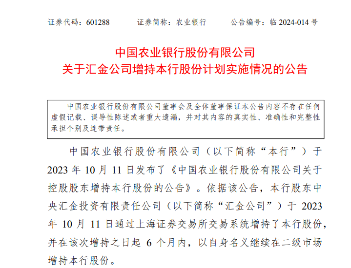 汇金公司出手了,四大国有银行同日公告,披露汇金增持情况。