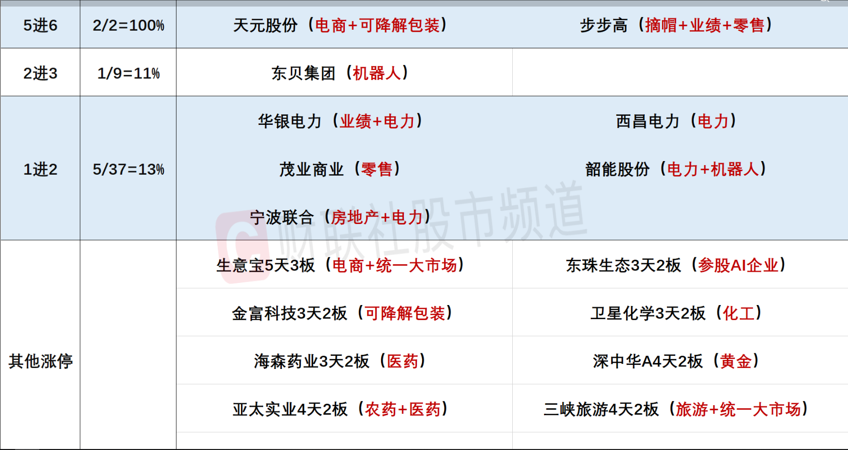 今日共65股涨停,连板股总数8只,其中三连板及以上个股3只,上一交易日共15只连板股,连板股晋级率20%(不含ST股、退市股)。