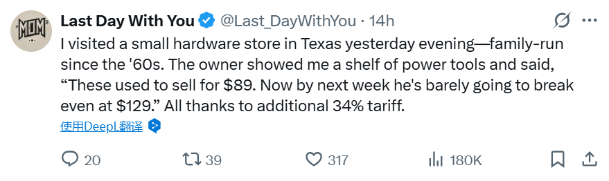 不少美国网友也在X上表达了担忧,有人指出,特朗普的关税做法是在与全世界为敌。还有人则给出明确数据,称原本卖89美元的工具,现在因为关税,价格急剧上升至129美元。