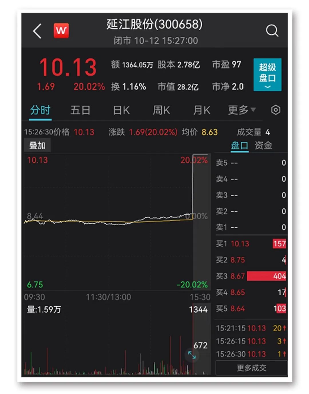 Wind数据显示,延江股份在收盘集合竞价前的最后一笔成交价格是8.64元/股,但在集合竞价阶段直接被拉升至10.13元/股,以“20CM”涨停报收。
