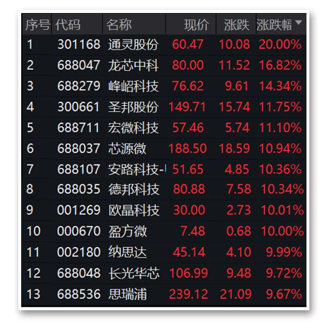 连续调整的半导体板块今日上演大反攻,Wind半导体板块涨幅超过10%或涨停的个股达10余只,近60只个股涨幅超过5%。截至收盘,通灵股份“20CM”涨停,龙芯中科、峰岹科技、圣邦股份、芯源微、宏微科技、安路科技-U、德邦科技涨幅超过10%,欧晶科技、盈方微、纳思达等涨停。