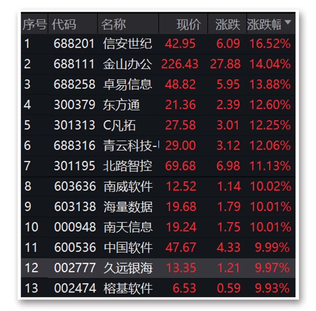 软件股今日也表现突出。截至收盘,信安世纪、金山办公、卓易信息、东方通、C凡拓、青云科技-U、北路智控涨幅均超10%,南威软件、海量数据、南天信息、中国软件、久远银海、榕基软件等涨停。