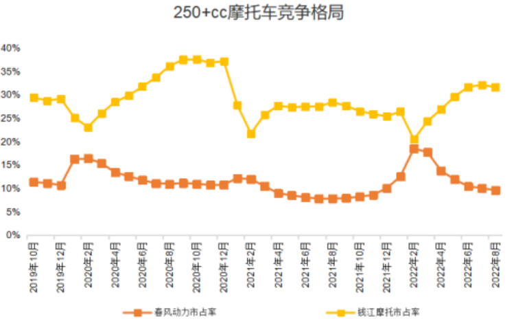 天风证券李鲁靖在9月20日研报显示,2022年8月,钱江摩托250cc+国内市占率为31.58%。春风动力250cc+国内市占率为9.58%,整体维稳。