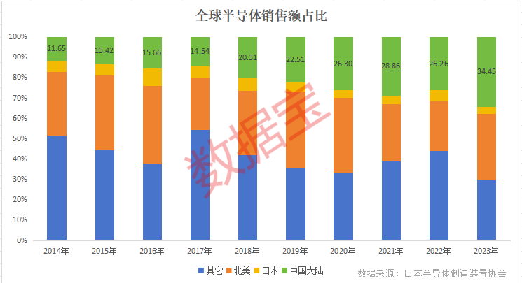 日本半导体制造装置协会数据显示,我国(大陆)半导体销售额从赶超日本,再到超越北美,自2021年以来稳居全球首位,2023年我国半导体销售额达到366亿美元,占全球比例首次突破30%,达到34.45%,同期日本仅有3.43%,北美为32.42%。