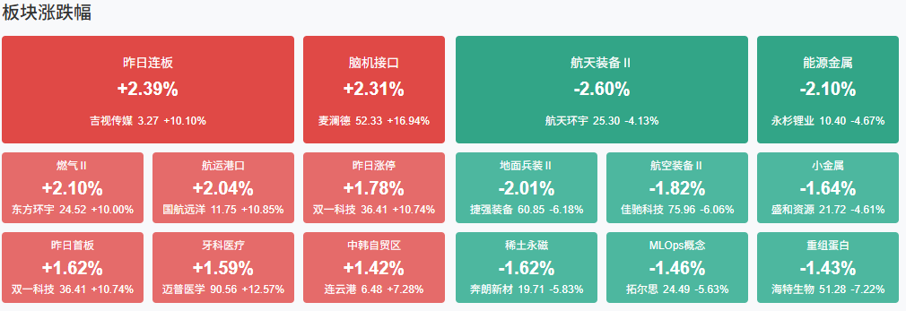 板块方面,脑机接口、港口、新疆、液冷服务器等板块涨幅居前,锂矿、军工、稀土永磁、光伏等板块跌幅居前。截至收盘,沪指涨0.53%,深成指涨0.34%,创业板指涨0.91%。