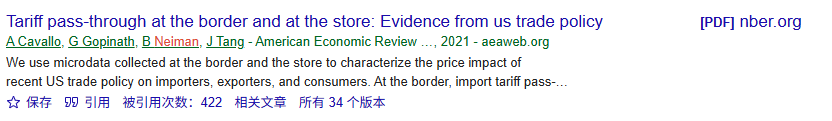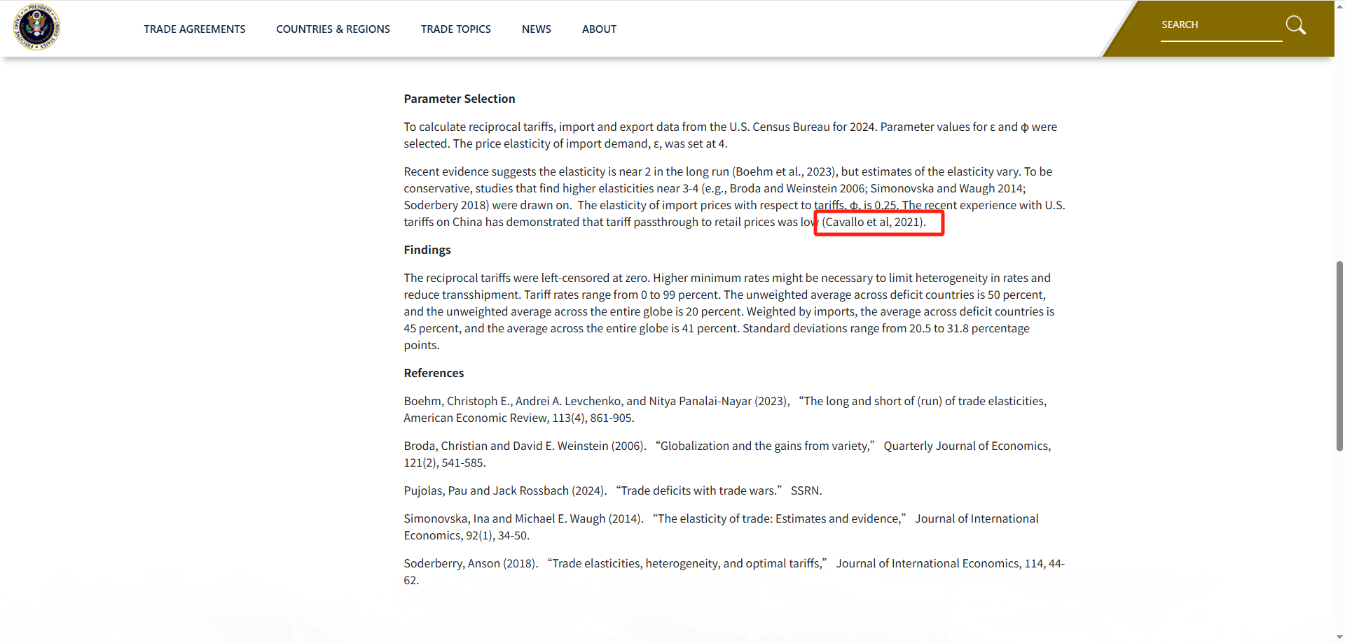 在美国贸易代表办公室关于对等关税的说明中,在进口价格相对于关税弹性的参数选择上引用了Neiman在2021年与其他三名作者共同完成的一篇论文。有趣的是,这篇论文在该机构说明末尾的参考篇目中并未列出。