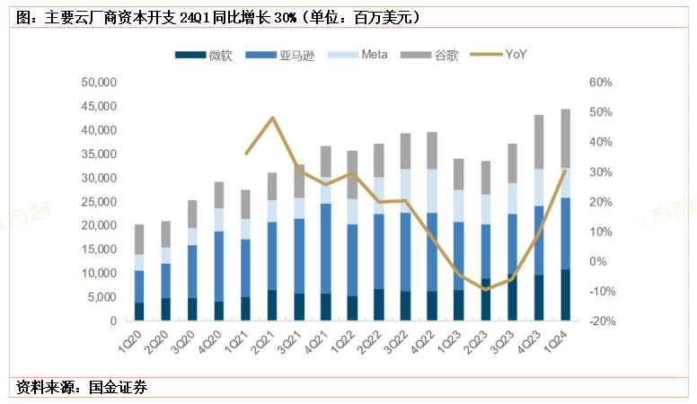 24Q1微软、亚马逊、Meta、谷歌四大云厂商资本开支合计为442.89亿美元,同比增长30.47%,且未来有望继续增长。Meta上调2024年资本开支,从300-350亿美元上调至350-400亿美元,主要是为了人工智能产品开发及所需数据中心设施建设增加投资;谷歌2024年Q1资本开支120亿美元,同比增长91%,环比增长9.2%,谷歌表示,2024年的每个季度资本支出都将保持在120亿美元以上,并且全年同比至少增长49%;微软在2024年第一季度的资本开支为140亿美元,同比增长增长79.4%,环比增长21.7%,并表示继续扩大AI资本开支,下季度CAPEX环比大幅增长。亚马逊24Q1资本开支为149亿美元,同比增长5%,并且公司认为24Q1资本开支为全年最低水平。
