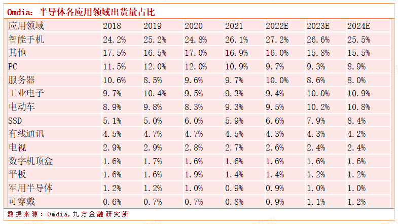 全球半导体按应用领域出货量来看,手机、PC、电动车、服务器等领域是出货量最大的四个领域,根据Omdia数据,2021年上述四个领域出货量占比分别为26.1%、10.9%、9.3%、9.7%,占比超过全球半导体出货量的56%。2023年以来,AI服务器领域需求快速上升,成为带领全球半导体销售额快速回暖的主要推动力,手机/PC出货量见底回升也是本轮行业见底的重要因素,以下我们从上述四个领域的表观数据,来看看行业需求复苏情况到底如何。