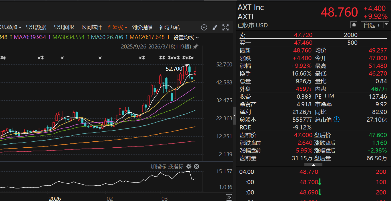 受上述消息影响,昨夜美股磷化铟概念股大涨,AXT涨幅一度触及16%,最终收涨9.92%。今年以来,该股已累计涨超198%。此外,光通信板块亦表现活跃,应用光电、Lumentum涨超7%,Coherent涨超4%。