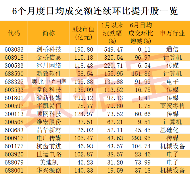 由于题材的炒作,部分股票在短期内成交快速放大,吸引大量资金涌入,但随着题材降温,股价也会随之调整。能够成交持续保持活跃的股票则少之又少。数据宝统计,今年以来,每个月度日均成交环比均提升的股票仅16只。6月以来融资净买入超亿元的是剑桥科技、皖新传媒、顺网科技。