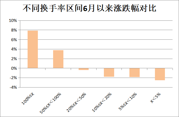 在A股市场上,高换手率意味着成交活跃,资金关注度更高,往往这类股票上涨动力更足。证券时报·数据宝统计,不含本月上市的新股,截至本周三收盘,6月以来换手率100%以上的股票平均涨幅7.86%;区间换手率50%至100%之间的股票平均涨幅3.75%;区间换手率越往下,股票表现越差,其中区间换手率5%以下的股票跌幅2.51%。