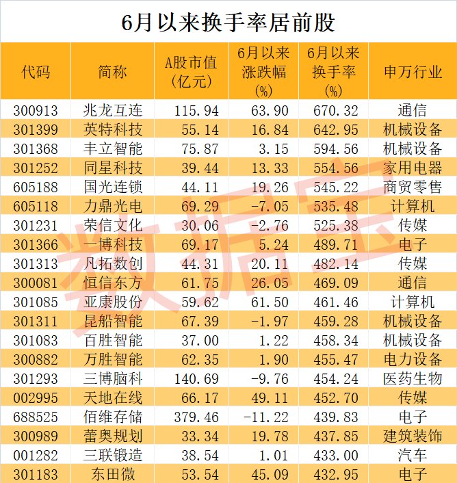 单只股票换手率最高的兆龙互连,6月以来累计换手率670.32%,相当于流通股筹码换了6.7遍。兆龙互连主要从事铜缆数据电缆、专用电缆及连接产品业务;6月15日公司在投资者互动平台表示,目前公司800G产品尚未形成量产,正在积极进行市场布局;6月21日,该股盘中创下历史新高,收盘股价跌幅6.3%。