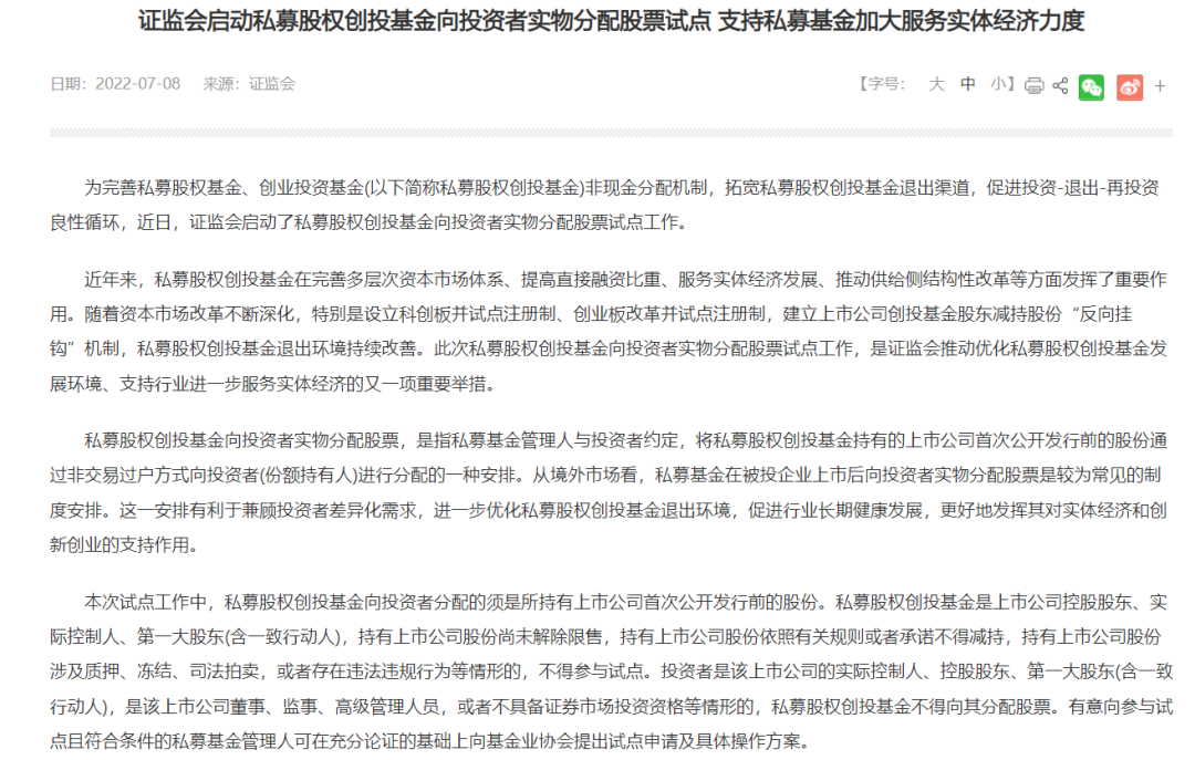 7月8日,证监会发布消息称,近日启动了私募股权创投基金向投资者实物分配股票试点工作。