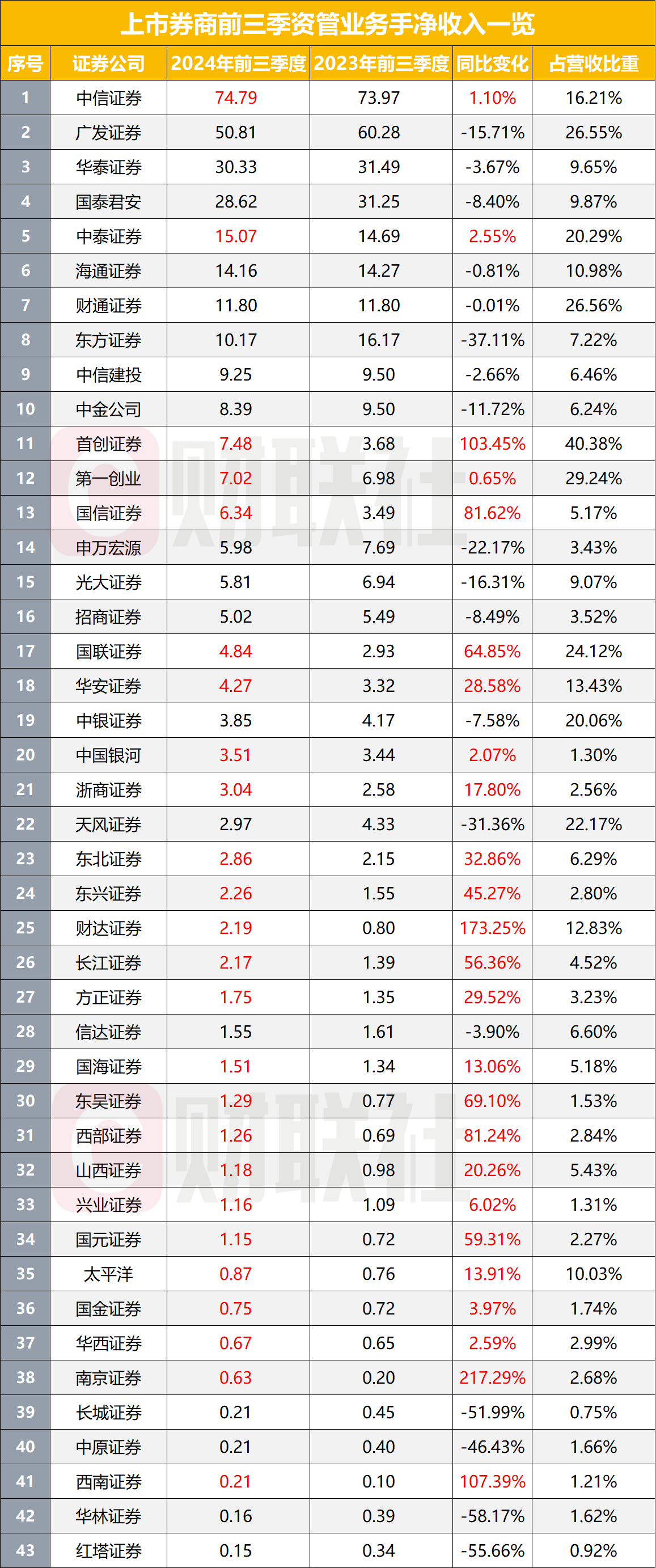 ①前三季度,25家上市券商的资管业务收入增速为正;