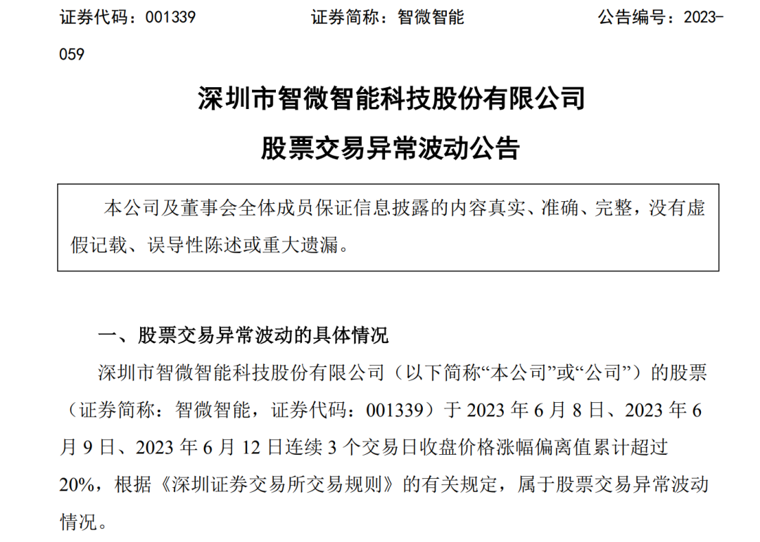 在此背景下,6月12日晚间,智微智能发布股票交易异常波动公告并提示多项风险。
