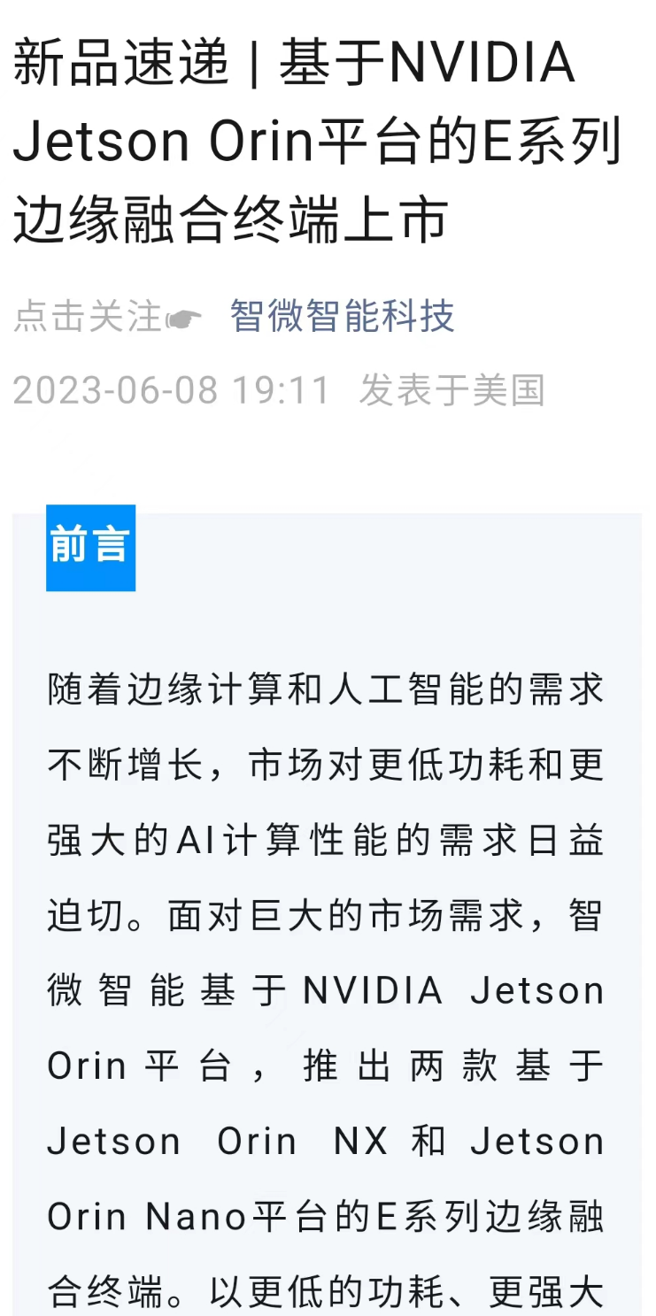 值得一提的是,此前的6月8日盘后,智微智能在其官方公众号表示,两款基于英伟达JetsonOrin平台的E系列边缘融合终端上市。以更低的功耗、更强大的AI计算能力,帮助客户加速AI在边缘侧场景下的开发部署。这或许是智微智能近两日受资金热捧的重要背景。