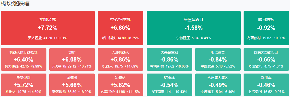 板块方面,锂矿、人形机器人、可控核聚变石墨电极、银行、钢铁、房地产等板块涨幅居前,ST、煤炭等少数板块下跌。。