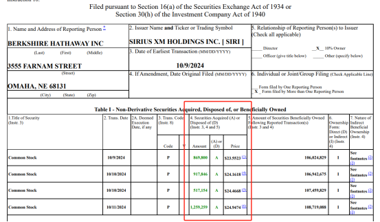 该份监管文件显示,伯克希尔·哈撒韦公司上周三购买了86.98万股Sirius XM股票;周四通过两笔独立交易分别买入91.78万股和51.72万股该公司股票;周五再买入125.93万股该公司股票。粗略计算,伯克希尔·哈撒韦在三天内买入了价值约8673万美元的Sirius XM股票,并将其在该公司的总持股增至1.0872亿股。