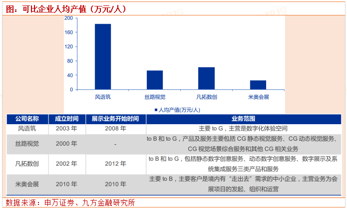 To G 展示业务稳居第一,风语筑龙头地位稳固。业内主要企业包风语筑、丝路视觉、凡拓数创和米奥会展等。规模方面,公司为业内第一梯队。2022 年前三季度风语筑/丝路视觉/凡拓数创/米奥会展的总营收分别为12.8/7.8/4.4/1.4亿元,其中风语筑大多为to G收入,丝路视觉和凡拓数创同时面向 G 端和 B 端,米奥会展主要面向 B 端,在G端展示业务收入上,风语筑稳居第一。人均产值方面,公司优势显著。2021 年风语筑的人均产 值为 184 万元/人,遥遥领先同行业可比公司。