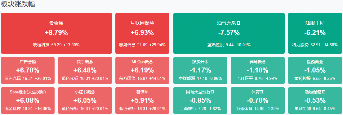 板块方面,贵金属、算力产业链、AI应用等板块表现活跃,油气产业链、煤炭、银行等板块表现落后。截至收盘,沪指涨1.92%,深成指涨3.87%,创业板指涨4.81%。