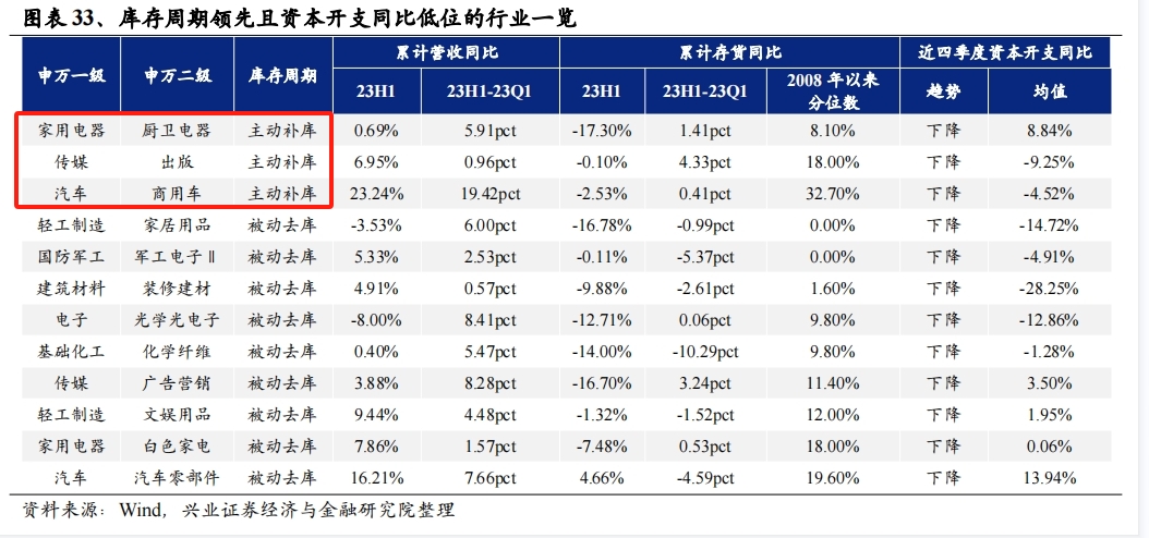张启尧等人进一步指出,目前来看,本轮全A库存周期切换已经启动,各行业间切换进度存在明显分化。结合前述复盘规律,可以优先关注库存周期领先且资本开支同比处在低位的行业,主要包括可选消费板块,即家用电器(厨电、白电)、汽车(商用车、汽车零部件)、轻工制造(家居用品、文娱用品)等;TMT板块(出版、广告营销、光学光电子)以及军工电子、装修建材、化学纤维等。