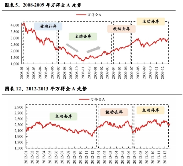复盘过去四轮库存周期(2008-2009年、2012-2013年、2015-2016年、2020-2021年),张启尧等人认为,出于对未来库存周期切换、经济走向复苏的乐观预期,(万得全A)市场行情通常会在主动去库末期启动,并延续至主动补库初期。2009年的经济强复苏驱动下,指数涨势持续演绎;2016年初两次“熔断”短暂地中断了指数的上涨,但后续指数又重新回到上行通道;2020年初的疫情冲击也并未能改变指数向上趋势。