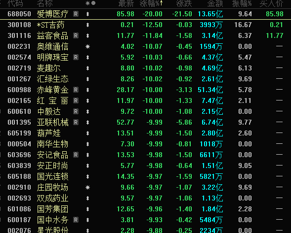 在超跌板块反弹的同时,种业、黄金概念、粮食概念、鸡肉、新零售等板块今日大幅调整。多只热门股股价表现低迷,红宝丽、中毅达、赤峰黄金、安记食品、双成药业、国芳集团、亚联机械均遭遇跌停板。