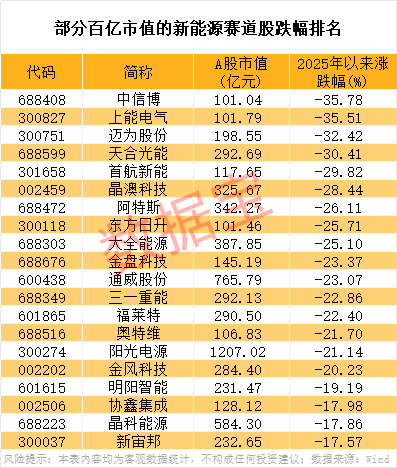 新能源领域涉及上市公司数量众多,本文主要以光伏、风电、储能、水电等领域作为观察对象。受行业竞争加剧、海内外需求波动等影响,新能源赛道多个行业增速放缓,相关公司股价表现低迷。据证券时报·数据宝统计,截至4月23日收盘,今年以来新能源赛道股平均下跌3.9%,跑输同期上证指数。包括迈为股份、晶澳科技、阿特斯、大全能源、阳光电源、通威股份在内的多只龙头股年内跌幅超过20%。