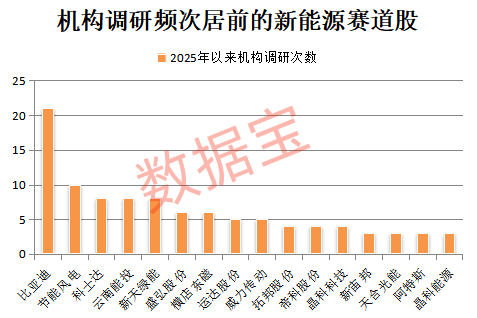 尽管二级市场走势不尽如人意,机构对新能源赛道股的关注度依然高涨。数据宝统计,今年以来合计有88只概念股获得机构调研,其中12股获调研3次以上,相当于月均至少调研1次。比亚迪、节能风电、云南能投、新天绿能、科士达获调研次数排在前五位。