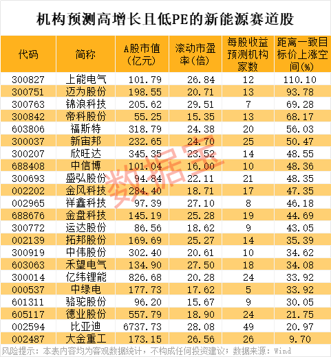 从未来增长潜力来看,根据5家及以上机构一致预测,数据宝统计,49只新能源赛道股今明两年净利润增速均有望超20%。比亚迪、亿纬锂能、晶科能源、德业股份、国轩高科等龙头股榜上有名。