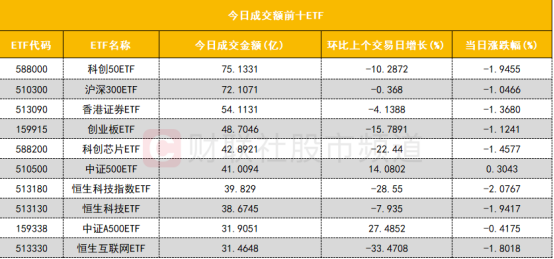 从成交额前十的ETF来看,科创50ETF(588000)成交额位居首位;沪深300ETF(510300)成交额位居第二位。