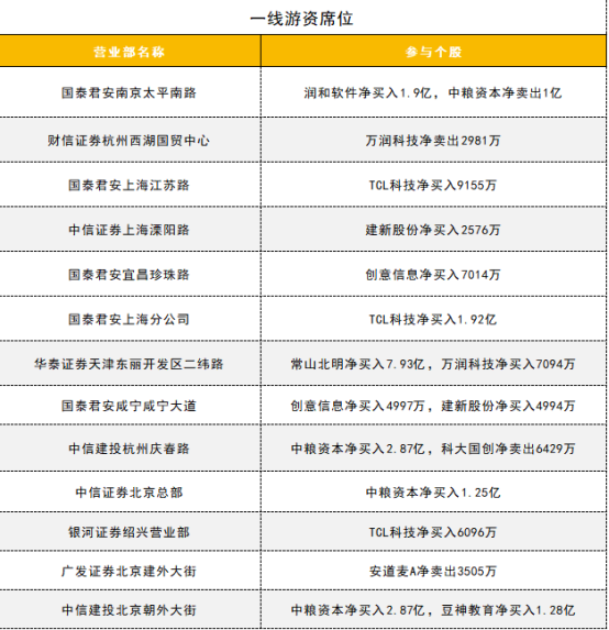 一线游资活跃度较高,今日创历史新高的鸿蒙概念股常山北明获华泰证券天津东丽开发区二纬路营业部买入7.93亿,另一只创历史新高的鸿蒙概念股润和软件获国泰君安南京太平南路营业部买入1.92亿;多元金融概念股中粮科技获三家一线游资席位买入,合计买入金额接近7亿;TCL科技获三家一线游资席位买入,其中国泰君安上海分公司营业部买入1.92亿。