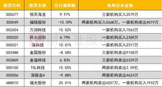 今日沪市龙虎榜数据暂未公布。深市龙虎榜机构活跃度一般,买入方面,存储芯片概念股万润科技获机构买入超7000万。