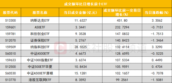 从成交额环比增长前十的ETF来看,纳斯达克ETF(513300)成交额环比增长451%位居首位;多只中证500指数ETF成交额大增,或与近期多只中证A500指数基金产品发行有关。