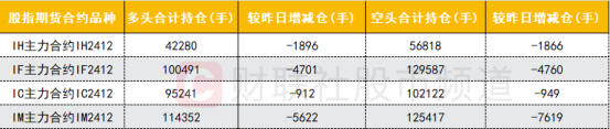 四大期指主力合约多空双方均减仓,IH、IF、IC合约多空双方减仓数量基本相当;IM合约空头减仓数量明显大于多头。