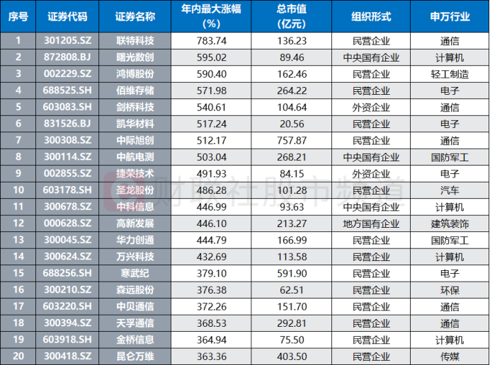 一般来说,个股异大幅动的股价表现常反映市场对该标的的偏好程度,因此,“翻倍牛股”也成为市场关注焦点。自今年以来,在各类题材、风口的催化下,不少牛股涨幅一度录得高倍,截至11月24日,联特科技以7.8倍的涨幅居年内牛股榜首位,曙光数创、鸿博股份、佰维存储、剑桥科技、凯华材料、中际旭创也一度迎来5倍以上涨幅行情。