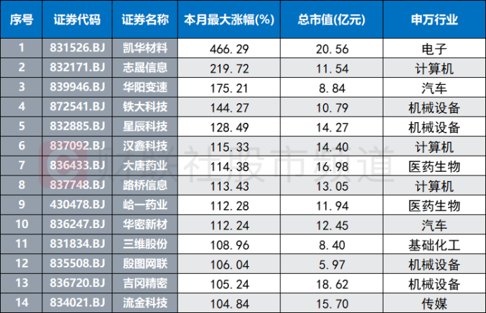 分证券板块来看,月内实现翻倍行情的个股中,北交所数量最多,整体占比近六成(14只),深市主板、创业板、沪市主板股分别占比近23%、9%、5%。近期,受政策面和资金面共同提振,北交所牛股频出,除10余只翻倍股外,另有77股月内最大涨幅超50%。具体个股来看,凯华材料、志晟信息最大涨幅分别录得466%、219%,华阳变速、铁大科技、星辰科技等股也表现活跃。