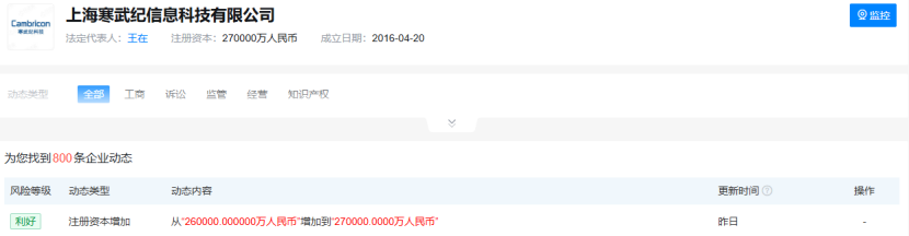此外,寒武纪亦有最新动作。天眼查显示,近日,上海寒武纪信息科技有限公司发生工商变更,注册资本由26亿元增至27亿元。
