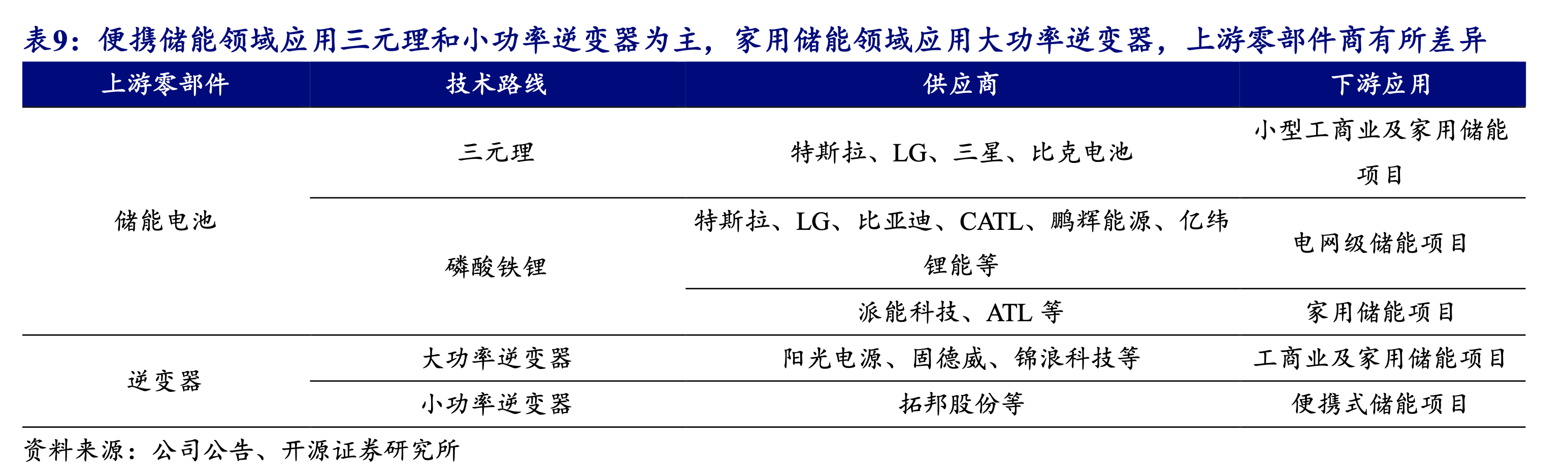 根据不完全梳理,目前涉足便捷储能产业链上游的公司包括特斯拉、LG、比克电池、阳光电源、固德威等。其中,拓邦股份主要聚焦3kw以下小功率储能逆变器(针对便携储能),比克电池主要聚焦三元理,已有储能领域出货经验。