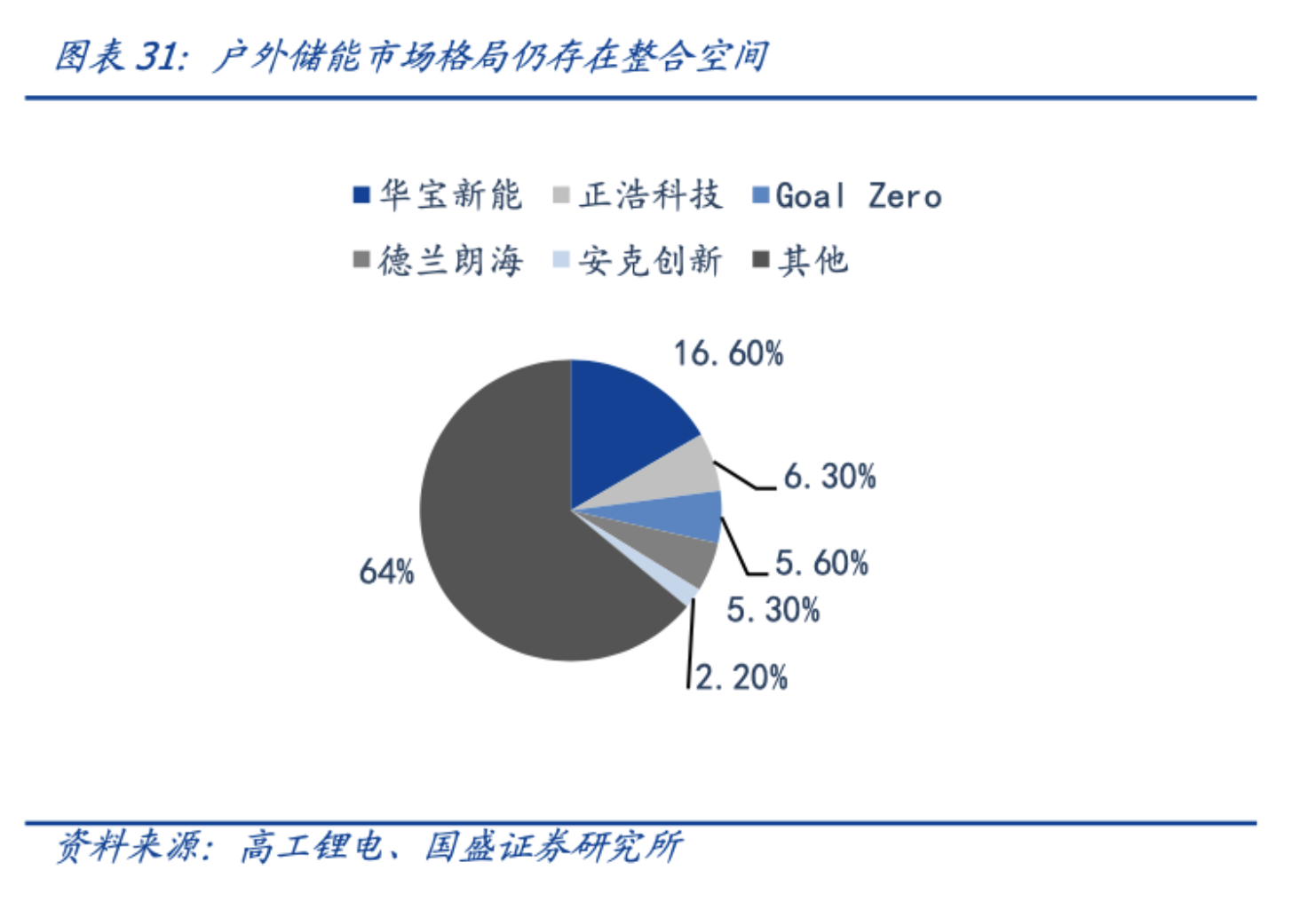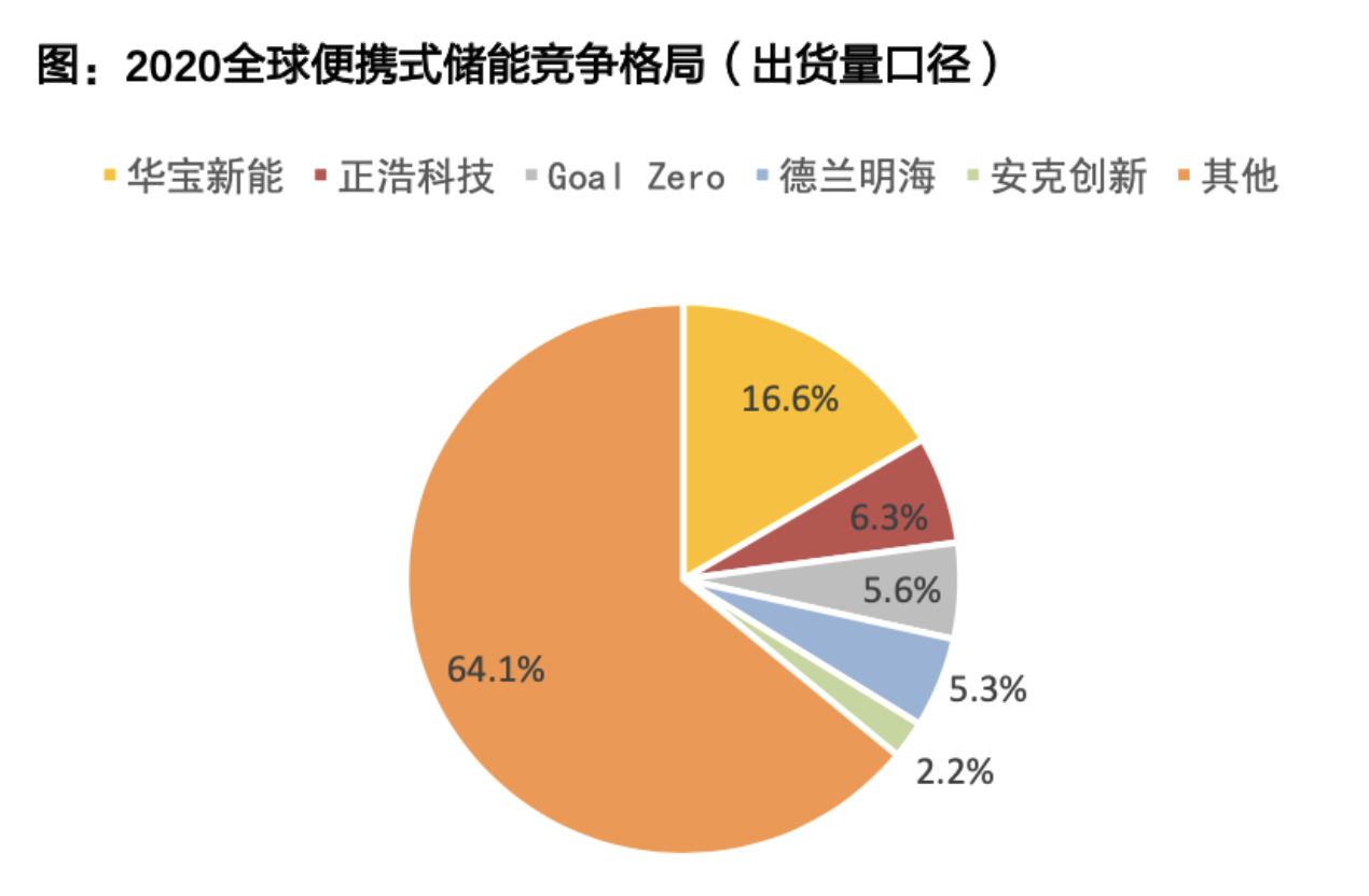 目前,在便携式储能设备市场中,从营收口径来看,行业前五企业占据着全球50%左右的市场份额,分别为华宝新能、正浩科技、Goal Zero、德兰明海和安克创新,其中华宝新能以21%的营收份额位列第一。海外企业Goal Zero占据9.5%的份额,据悉,其主要由国内的豪鹏科技和博利威为其代工。