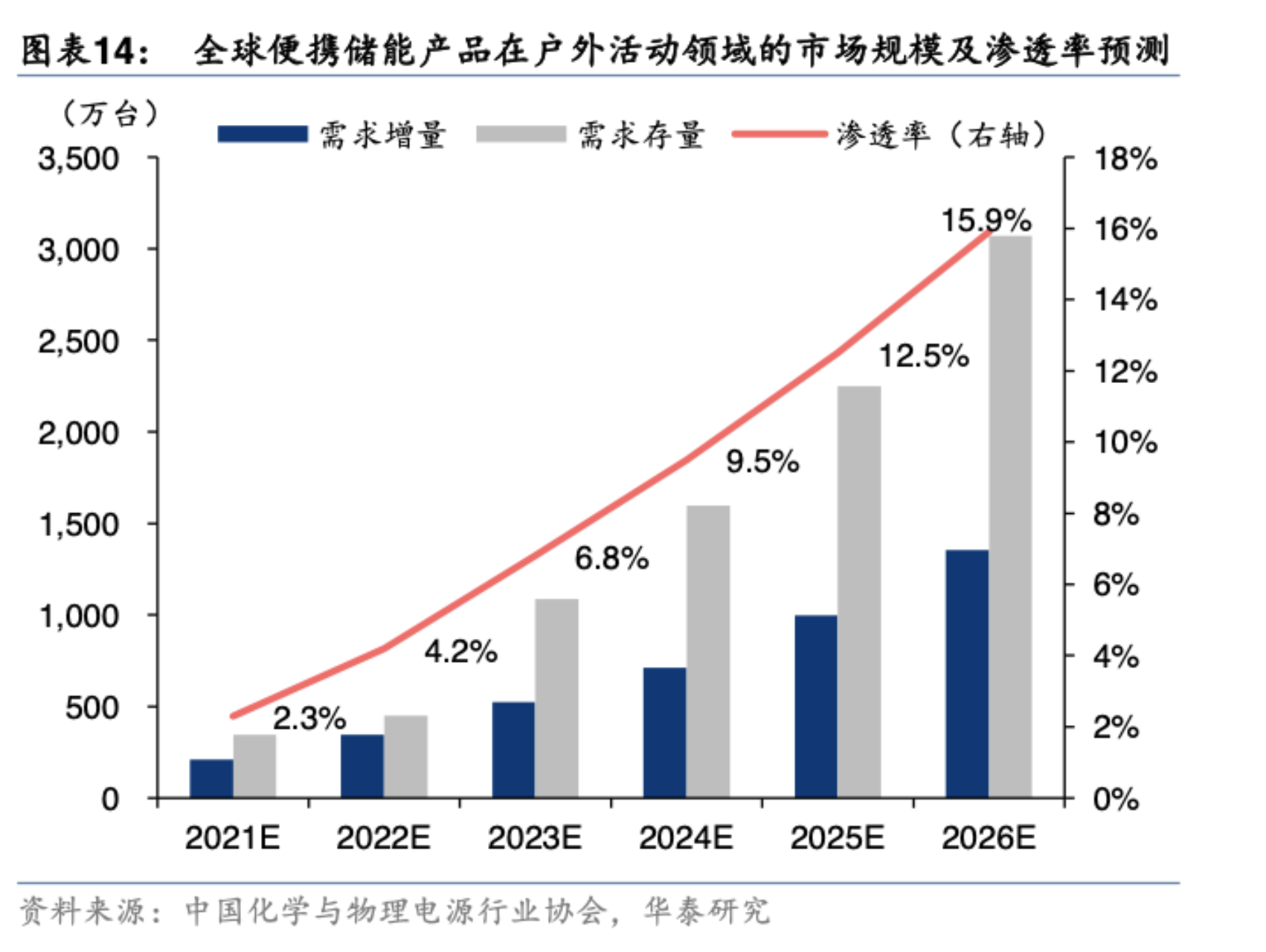 华泰证券9月7日研报表示,随多元化、高品质的户外露营需求提升,便携式储能的潜在市场需求将得以快速释放。据数据测算,预计2026年户外活动领域对便携储能产品的购置需求将达1355万台,场景渗透率可达15.9%。