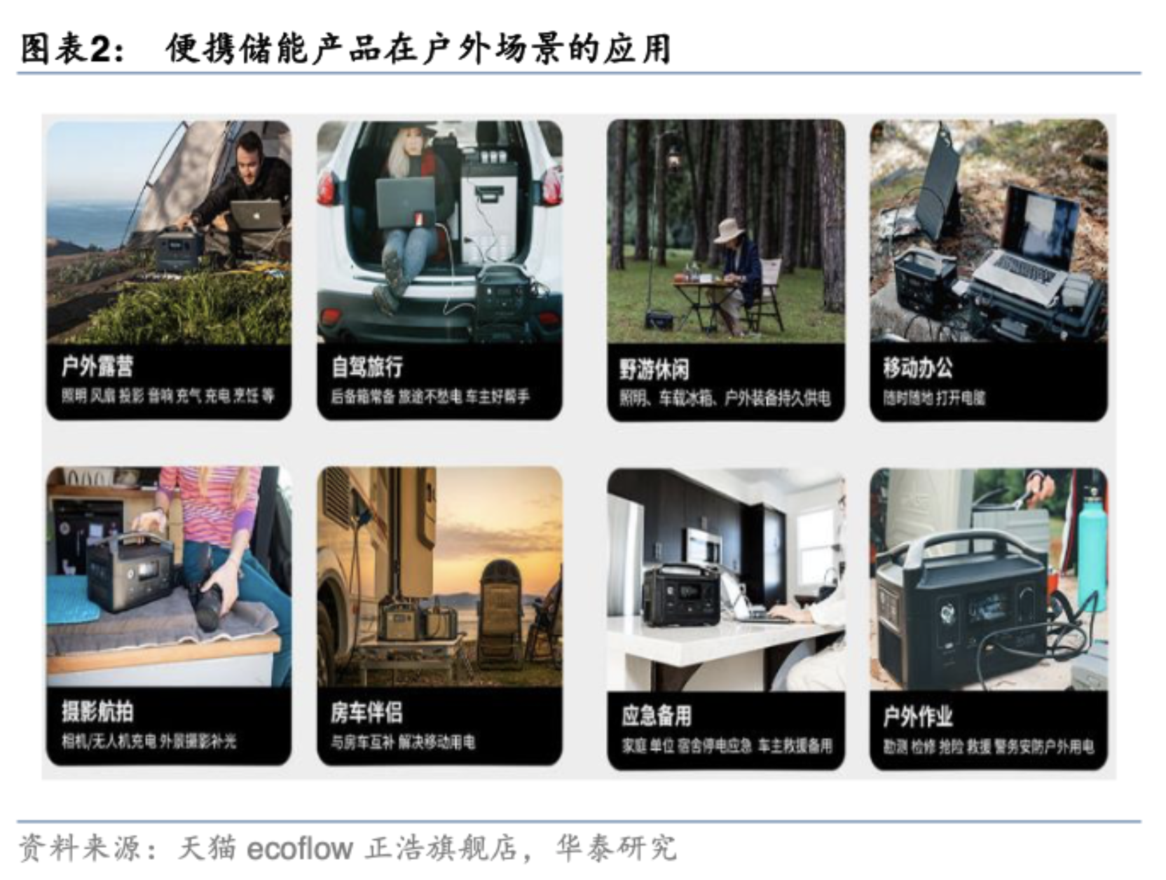 与此同时,便携式储能产品凭借智能便携、操作简便、容量大、功率大、适配性广泛等诸多优势,几乎已覆盖所有的日常电子电气设备,因此,除户外出行外,当前还应用于应急设备等多场景,适配电力市场的新需求。
