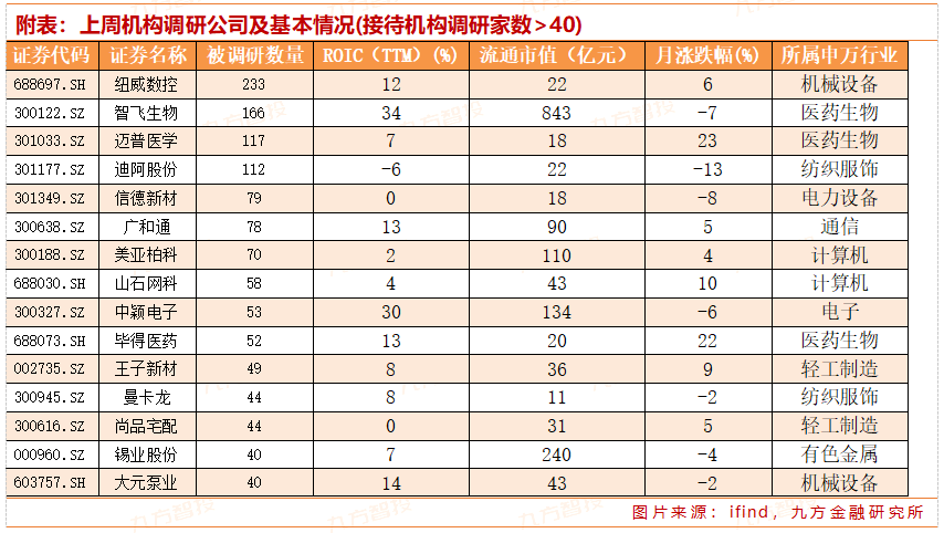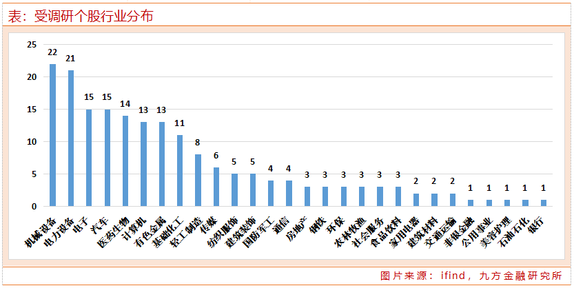从行业分布来看,本周机械设备、电力设备行业均有超20家上市公司接受调研;随后为电子、汽车行业,均有15家上市公司接受调研。