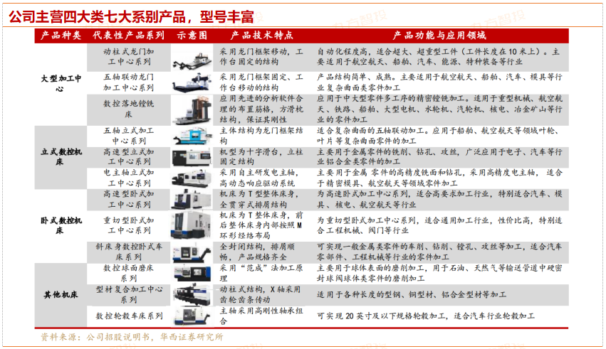 公司已推出200多种型号的数控机床,产品包括大型加工中心、立式数控机床、卧式数控机床、其他机床等四大类别;覆盖了从简单零件加工的普通数控机床到繁琐曲面加工的大型五轴联动数控机床。公司通过“多型号、高性能”的发展格局,在产品类别上向复合化方向发展,在产品性能上向高速度、高质量、高效率方向发展。