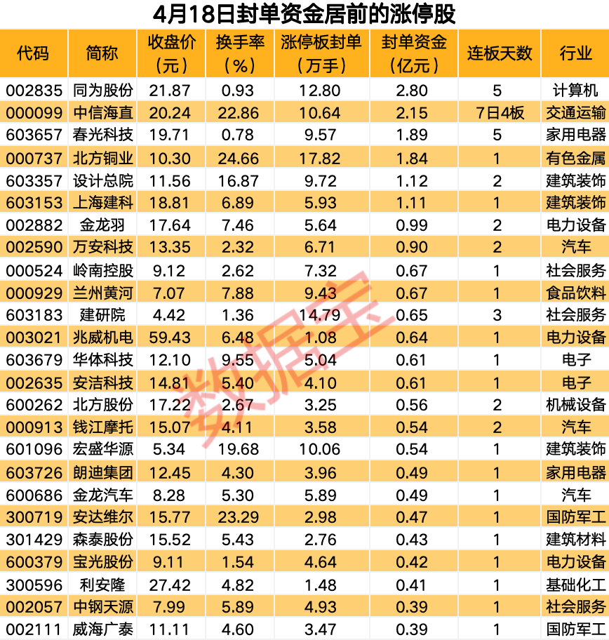 以封单金额计算,6股封单金额在1亿元以上,同为股份、中信海直、春光科技封单金额居前,分别为2.8亿元、2.15亿元、1.89亿元。